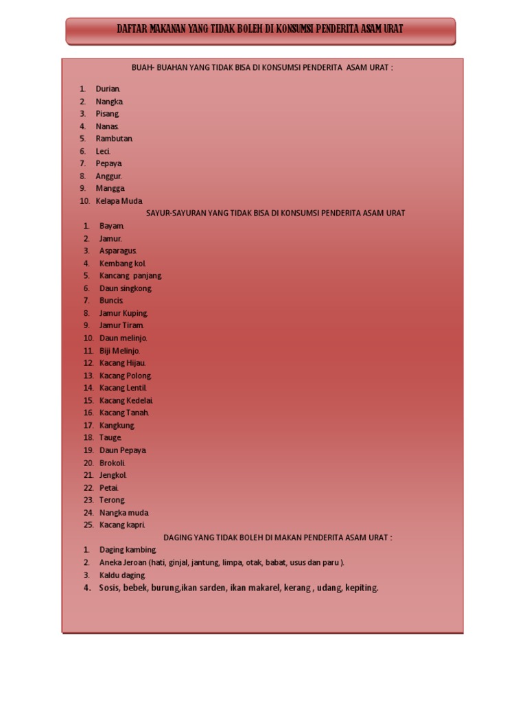 Pantangan asam urat yang harus dihindari dipublish tanggal: feb 22, 2019 update terakhir: okt 12, 2020 tinjau pada mei 22, 2019 waktu baca: 3 menit. Asam urat (bahasa inggris: uric acid, urate) adalah senyawa turunan purina dengan rumus kimia c 5 h 4 n 4 o 3 dan rasio plasma antara 3,6 mg/dl (~214µmol/l) dan 8,3 mg/dl (~494µmol/l) (1 mg/dl = 59,48 µmol/l). have been found upcoming links cara mengobati radang asam urat kronis » view news by jhons koplak 1 votes by jhons koplak 1 votes cara mengobati penyakit asam urat men » view news by jhons koplak 1 votes koplak added a new link " cara mengobati radang asam urat kronis " 13 hour(s) ago write a asam urat english comment Kadar asam urat pada individu dengan obesitas miftahul rohmah1evi puspita sari2ratna dewi permatasari3 123stikes insan cendekia medika jombang 1email: miftahulrohmah1515k@gmail. com2 email: eps. imun17@gmail. com3 wahib. rifai81@gmail. com abstrak pendahuluan obesitas kini menjadi suatu permasalahan baik itu terjadi di negara maju dan negara berkembang pada bidang kesehatan serta gizi masyarakat dunia.